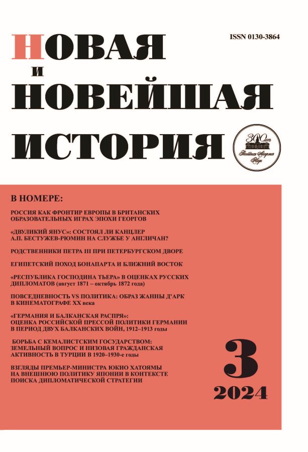 The author explores the history of the establishment of the republican system in France in the early 1870s. The period is associated with the activities of the first President of the Third Republic, Adolphe Thiers (1871–1873). Russian diplomats in Paris, Ambassador Prince Nikolai Orlov and Embassy Counselor Grigory Okunev, witnessed first-hand Thiers’ efforts to stabilise France after its defeat in the War of 1871. They developed a trusting relationship with Thiers, who initiated Russian diplomats into his plans. For this reason, the study of dispatches, letters, and analytical notes regularly sent from the Paris Embassy to St. Petersburg is of particular interest to those who study the initial period of the formation of the Third Republic. Until recently, this type of sources has attracted little attention on the part of researchers. This article fills up this obvious gap. The study of diplomatic communications demonstrates that Russian diplomats were quite objective in their analysis of the internal political processes taking place in France after the end of the Franco-German War. They gave a balanced assessment of Thiers’ work, tracing the evolution of his views from constitutional monarchist to conservative republican. The chronological framework of the article covers the period from Thiers’ election as President of the Republic in August 1871 to October 1872, when a crisis arose in his relations with the monarchist majority of the National Assembly.