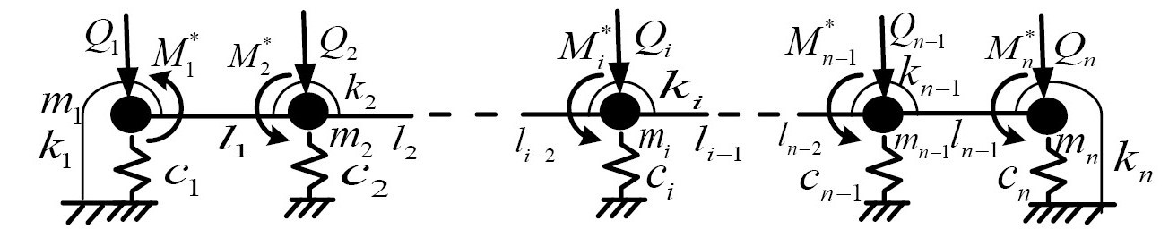 Сконструируем дискретную расчетную модель для исследования изгибных установившихся колебаний конструкции как совокупность из n однотипных последовательно соединенных элементов, состоящих из масс, шарнирно соединенных абсолютно жестких стержней и безынерционных линейных и спиральных пружин (см. рис. 2); на каждую из масс действуют внешние гармонически изменяющиеся во времени поперечная сила и изгибающий момент.
