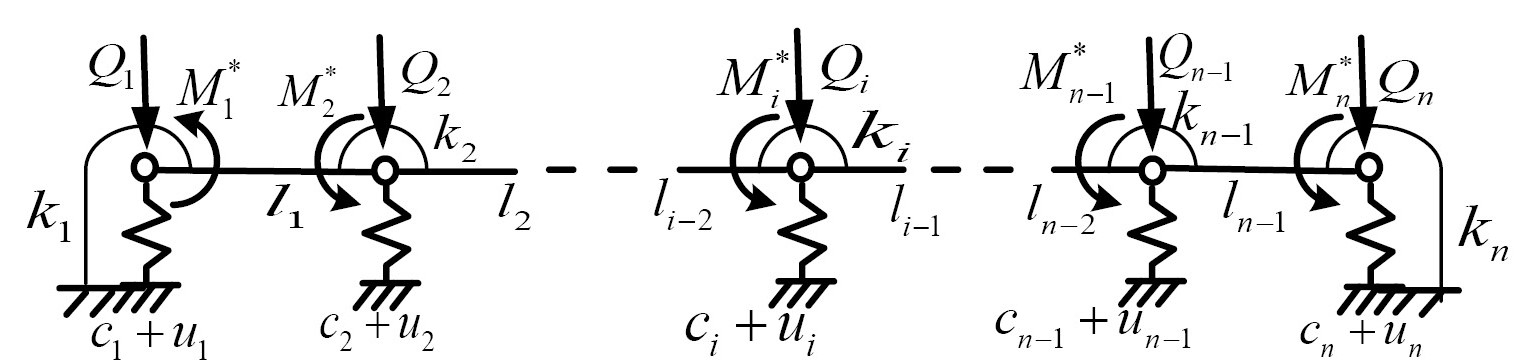 где L — протяженность конструкции, li, mi, ki, ci, Qi, — протяженность, масса, изгибная жесткость, жесткость основания, внешние сила и изгибающий момент для i-го элемента, соответственно. Очевидно, что при увеличении числа элементов дискретная модель неограниченно стремиться к исходной конструкции. При этом граничные условия и наличие промежуточных опор должны быть учтены коррекцией значений жесткости соответствующих линейных и спиральных пружин (например, жесткая опора может моделироваться пружиной, жесткость которой превышает остальные на 5–7 порядков).