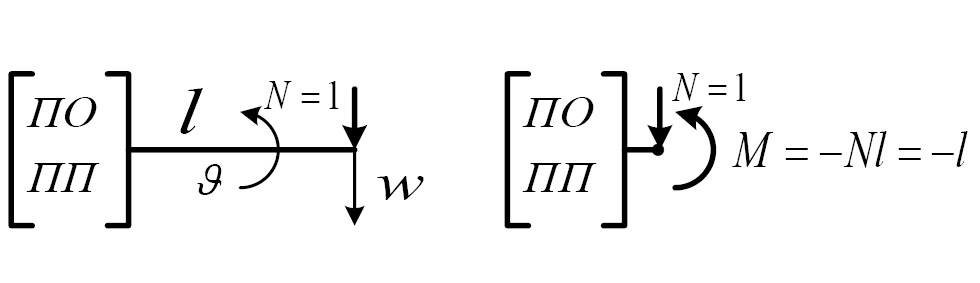 При выводе этих зависимостей учитывалось, что приложение единичного усилия N = 1 вызывает появление в предыдущем сечении такого же реактивного усилия N = 1 и момента M = −lN = −l. Кроме того, прогиб в рассматриваемом сечении формируется не только прогибом в предыдущем сечении, но и дополнительным прогибом от угла поворота стержня.