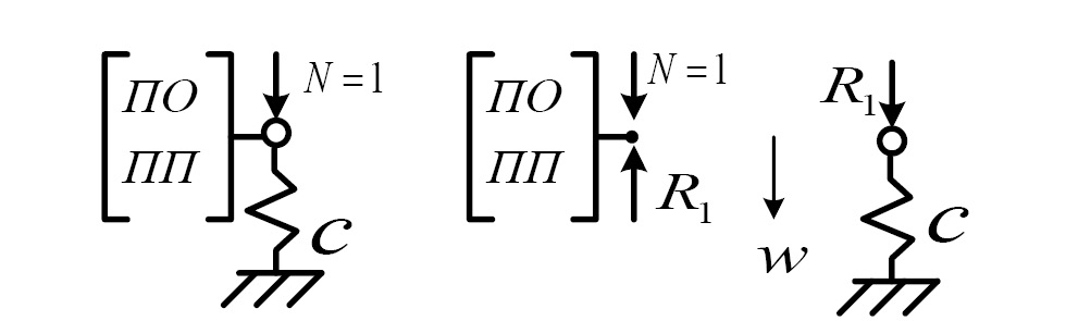 На следующем этапе учтем изменение ПО и ПП при прохождении упругой опоры жесткостью c = ci + ui. Для этого необходимо раскрыть своеобразную «статическую неопределимость», возникающую из-за появления реакции связи (см. рис. 6). Для упрощения записи верхний штрих у ПО и ПП опущен. ПО и ПП после прохода упругой опоры снабжены сверху двумя штрихами. На рис. 6 изображена схема, позволяющая записать выражений для ПО и ПП при приложении единичной поперечной силы.
