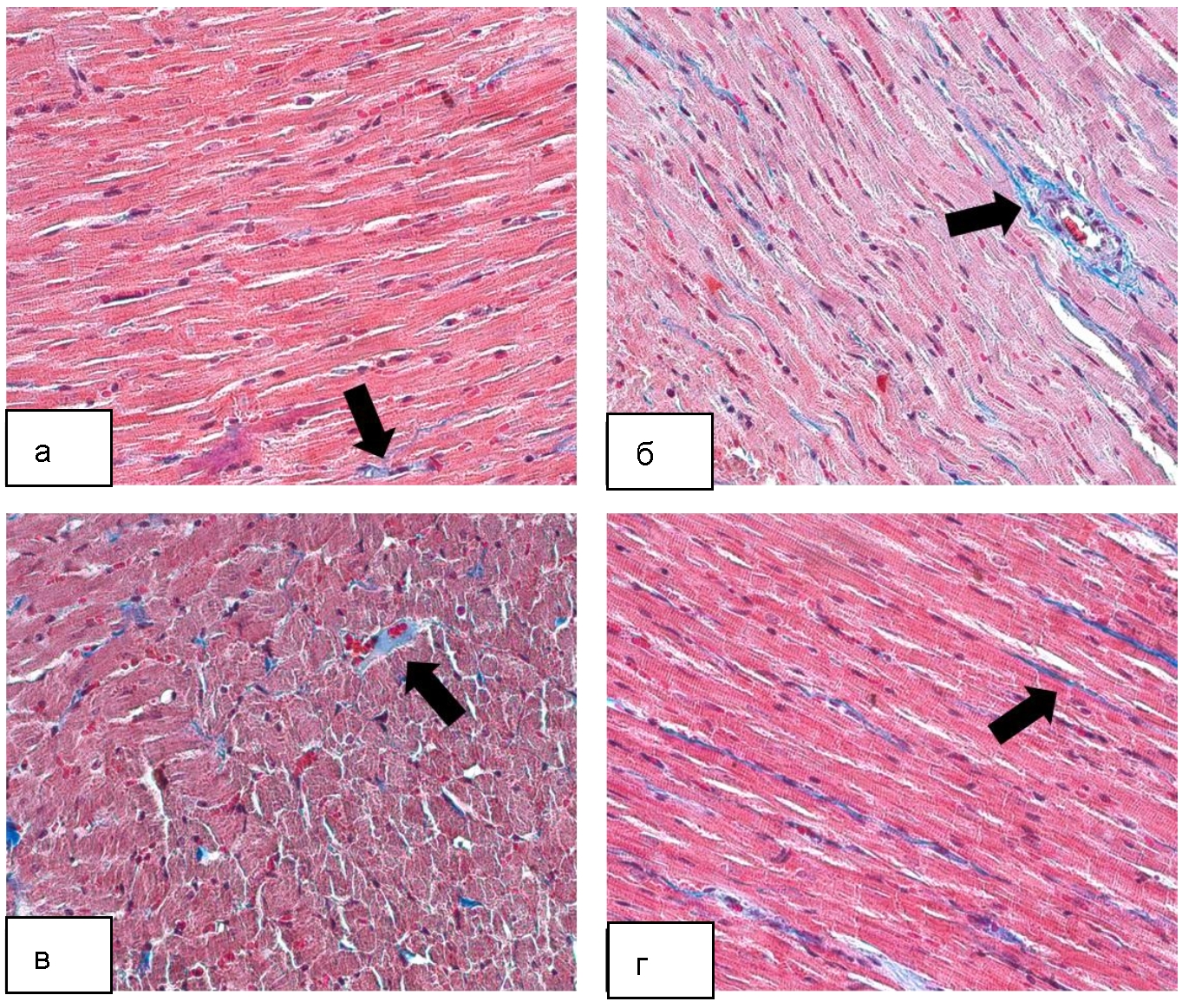 Рис. 1. Структурные изменения миокарда левого желудочка: а – 1-я группа, миокард крысы в возрасте 19 мес.; б – 2-я группа, миокард крысы в возрасте 19 мес. с экспериментальным сахарным диабетом; в – 3-я группа, миокард крысы в возрасте 19 мес. с экспериментальным сахарным диабетом, получавшей аминалон; г – 4-я группа, миокард крысы в возрасте 19 мес. с экспериментальным сахарным диабетом, получавшей сукцикард. Окраска по Массону. ×400. Черные стрелки – соединительная ткань, участки фиброзирования