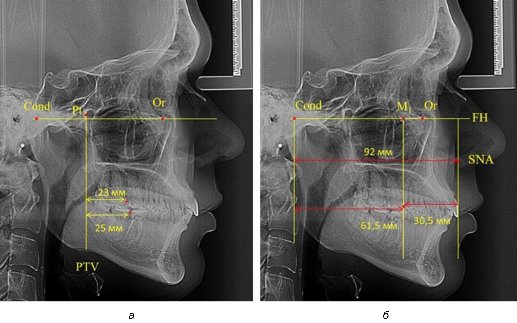 При проведении анализа к Франкфуртской горизонтали проводили передний и задний перпендикуляры. Передний спинальный перпендикуляр проходил через выступающую точку передней носовой ости (spina nasalis anterior – SNA), а задний суставной перпендикуляр опускали из кондилярной точки Cond. Молярный перпендикуляр проводили через медиальную поверхность первого постоянного моляра. Указанная вертикаль отделяла замещающие зубы постоянного прикуса от добавочных зубов (постоянных моляров), что вполне логично для анализа положения первых постоянных моляров в гнатическом комплексе (рис. 1).