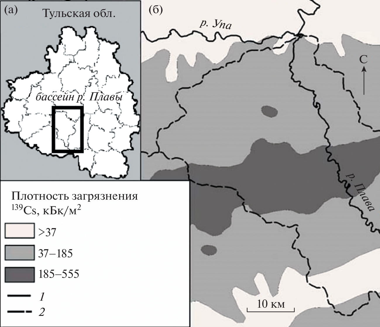 2. Fig. 1. The location of the Plava River basin (а) and its level of the radioactive contamination (б) (Izrael et al., 1996). 1 – rivers, 2 – the Plava River basin boundary.