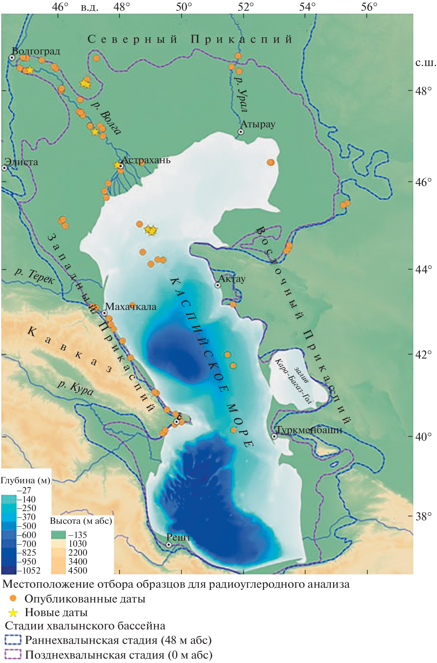 The paper analyzes 234 radiocarbon dates of the Khvalynian deposits obtained by researchers over more than 50 years of studying the Caspian region. Most of the dates were obtained from shell material, including endemic species of mollusks of the genus Didacna that lived in the early and late Khvalynian basins of the Caspian Sea. The radiocarbon coverage of the Khvalynian stage is in the range of 46–8.3 cal. ka BP. The most ancient dates were obtained from the Khvalynian deposits of the Caspian Sea. The largest number of dates falls within the interval of 17–12.5 cal. ka BP. The development of the early Khvalynian transgression began 40–35 cal. ka BP. During 25–18 cal. ka BP the coastline of the early Khvalynian basin reached levels above 0–5 m asl, and the level of 20–22 m asl developed in the range of 17–13.5 cal. ka BP. After 12.5 cal. ka BP the sea level was falling probably leading to the development of Enotaevkian regression. The Upper Khvalynian deposits dated between 11–8.5 cal. ka BP probably correspond to the development of the late Khvalynian transgression. The age interval for the development of the maximum phase (45–48 m asl) of the Early Khvalynian transgression has not been determined according to the currently available data.