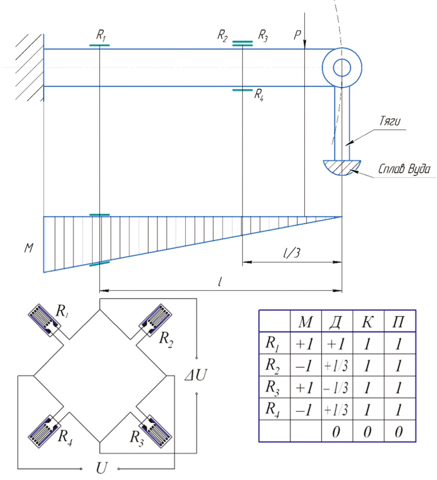 При подключении тензорезисторов в измерительный мост, как показано на рис. 1, происходит вычитание из сигнала полной деформации, измеряемой тензорезистором R1, сигналов с трех других датчиков R2, R3, R4.