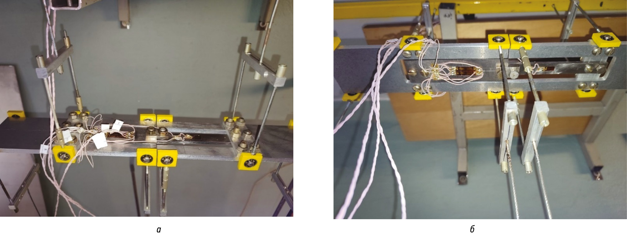 На рис. 3 (а) и (б) представлена разработанная установка для определения петли гистерезиса, реализующая схему четырехточечного изгиба балки.