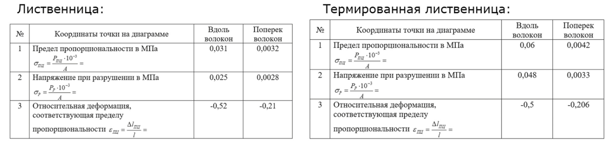 После проведения опыта были получены следующие характеристики: предел пропорциональности, напряжение при разрушении, относительная деформация. В нижеприведенных таблицах показаны сравнительные характеристики лиственницы и термолиственницы.