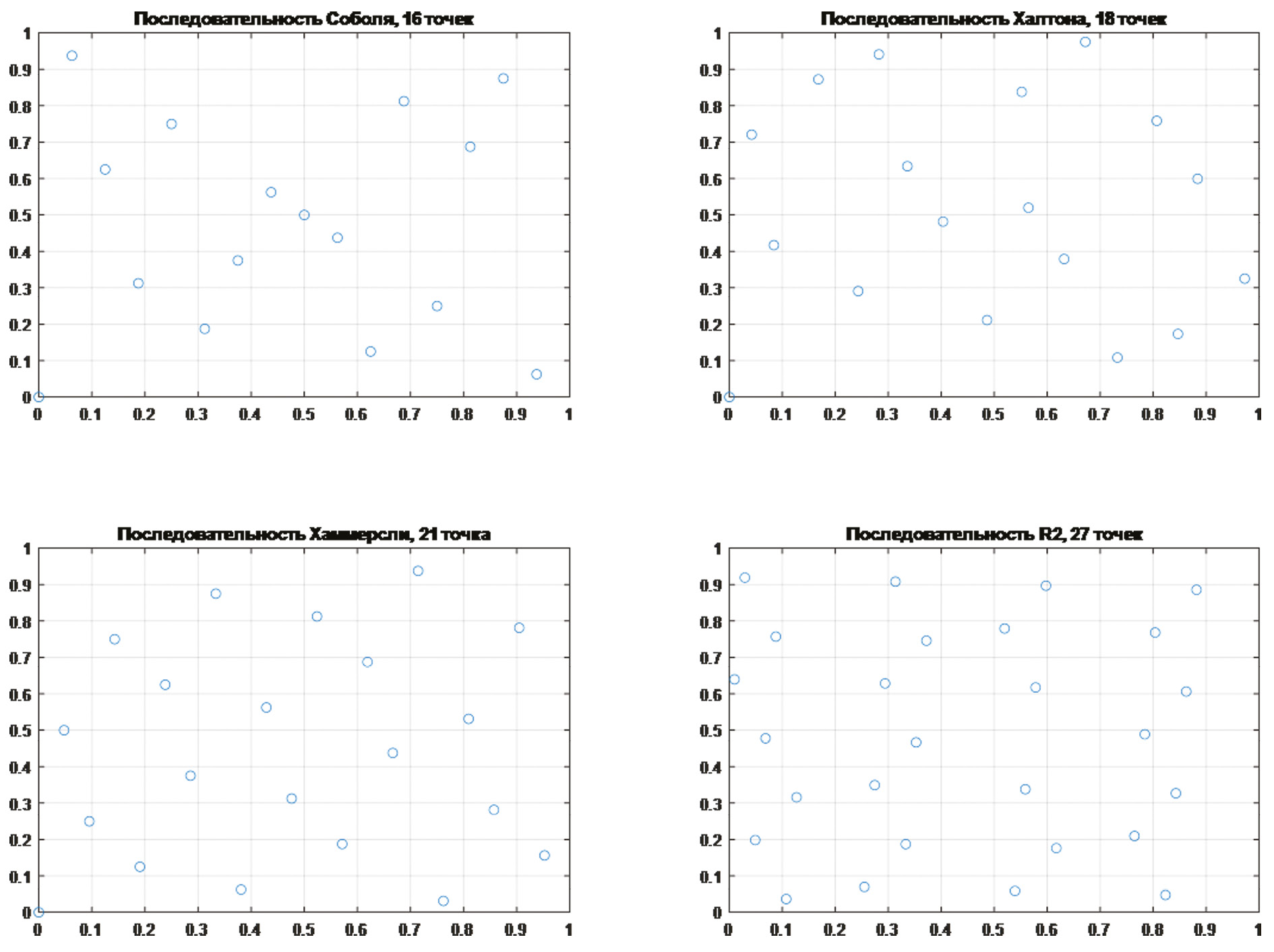 Выводы. Среди квазислучайных последовательностей лучшими оказались последовательности Соболя и Халтона. С применением последовательности Соболя было достигнуто допустимое качество набора для 16 образцов; последовательностью Халтона — для 18 образцов.