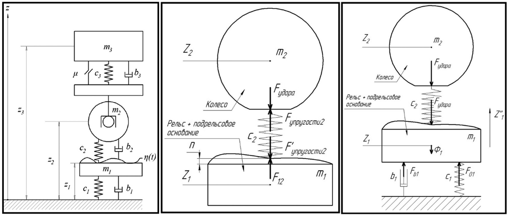 Fтр=2πtan-1z˙2-z˙3μc3z3-z2— функция силы трения фрикционного гасителя; μ — коэффициент сухого трения фрикционного гасителя; m1, m2 и m3 — приведенная масса участка пути, масса колеса и подведенная к нему масса неподрессоренных частей тележки и масса обрессорных частей тележки и части кузова, приходящегося на одну тележку соответственно; b1, b2, b3 — коэффициенты вязкого демпфирования пути, демпфирования в зоне контактного взаимодействия колеса с рельсом и демпфирования в зоне контактного взаимодействия колеса с рельсом; c1 — жесткость рельса и подрельсового основания пути; c2 = [Если (z2z1 – η) > 0, тогда 0, иначе 109] Н/м — функция жесткости в зоне контактного взаимодействия колеса с рельсом; c3 — жесткость основного рессорного комплекта.