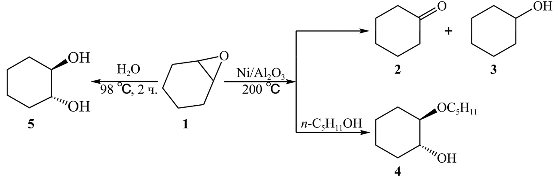 Обоснование. Известно, что из-за высокого напряжения оксиранового кольца эпоксиды могут легко раскрываться. Реакцию можно проводить как стехиометрически, так и каталитически. В случае использования последнего метода оксирановое кольцо может быть раскрыто с использованием катализаторов — металлов на носителе в присутствии водорода. В данной работе представлены результаты экспериментов по гидрированию циклогексеноксида 1, находящегося в составе побочных продуктов производств циклогексанона (спиртовая фракция, СФПК, содержащая амиловый спирт), с использованием никелевого катализатора, нанесенного на Al2O3. Гидрирование проводилось в проточном стеклянном реакторе вытеснения. Также с соединением 1 был проведен гидролиз с целью получения транс-1,2-циклогександиола (5).