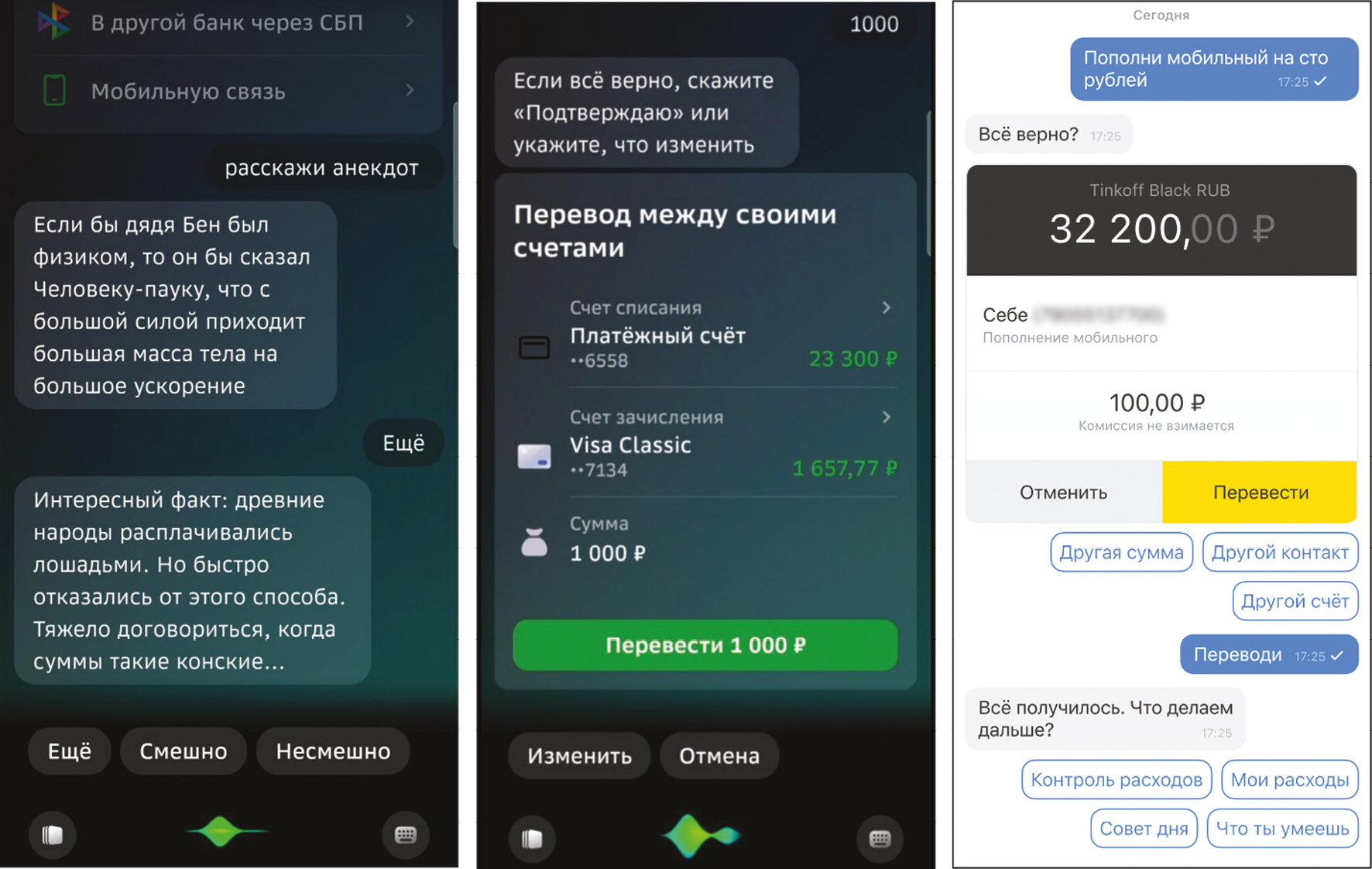 Рис. 1. Осуществление диалога и перевода денежных средств с помощью чат-ботов Сбербанка и Тинькофф Банка