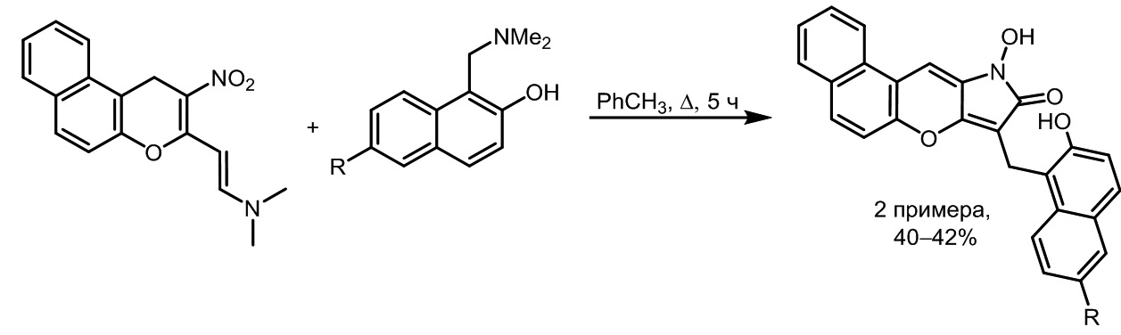 Далее нами была исследована способность α-[2-(диметиламино)винил]-β-нитробензохроменов выступать в качестве диенофилов в реакциях с о-метиленхинонами (рис. 3). Однако в реакции с основанием Манниха вместо ожидаемых продуктов реакции Дильса–Альдера — соответствующих 2’-нитро-1H,1’H-2,3’-бибензо[f]хроменов — были выделены 10-гидроксибензо[5,6]хромено[3,2-b]пиррол-9(10Н)-оны.